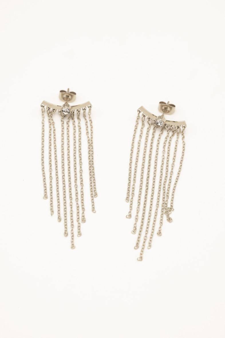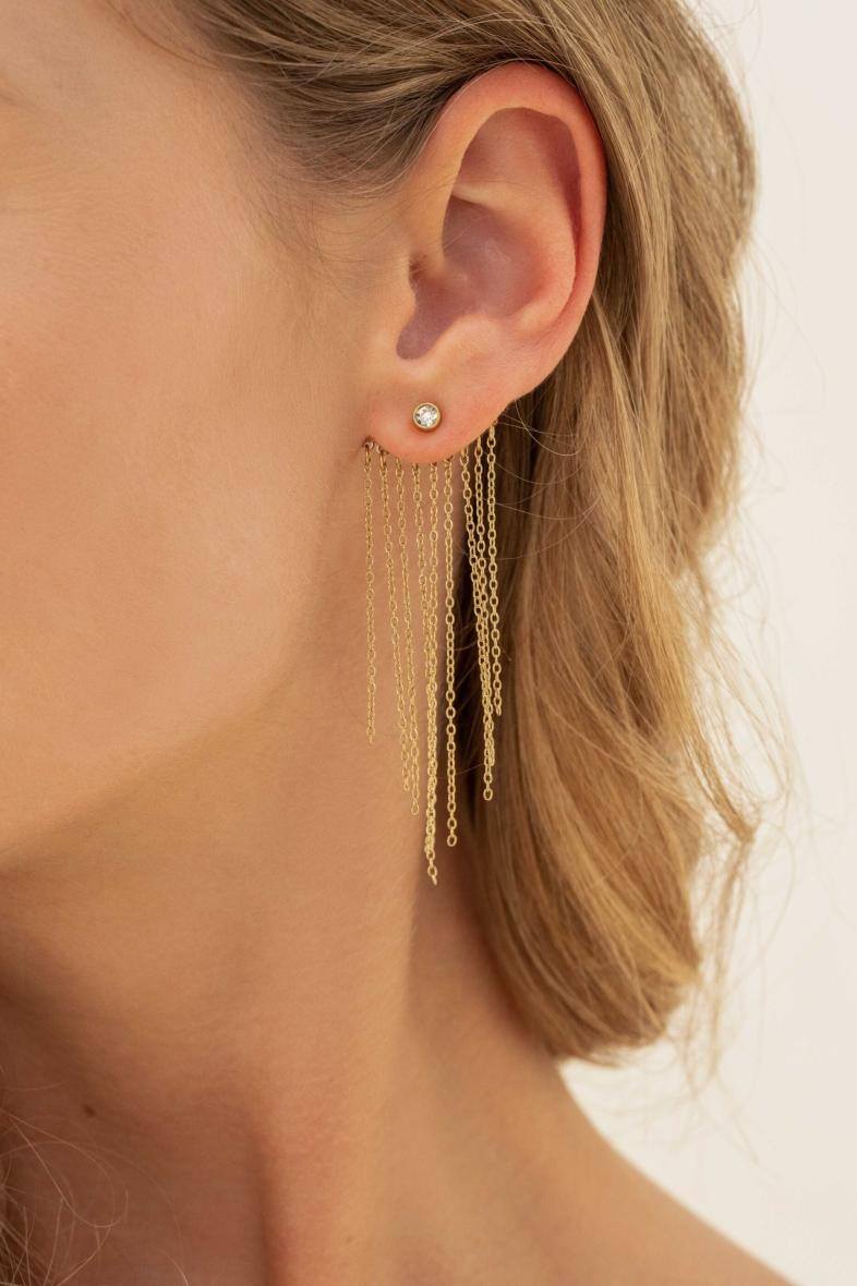 Diese stilvollen Ohrstecker vereinen funkelnde Eleganz mit modernem Schwung. Ein feiner Kristall schmückt den Ohrstecker, während neun zarte, baumelnde Ketten bei jeder Bewegung einen eleganten Fall erzeugen. Ideal für Abendlooks, besondere Anlässe oder als glamouröses Statement im Alltag.