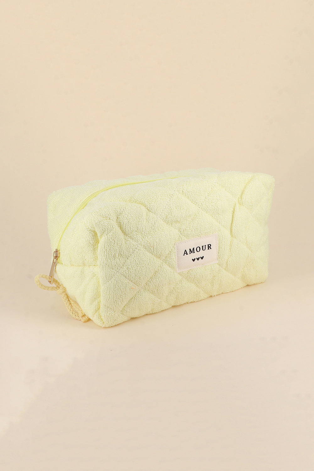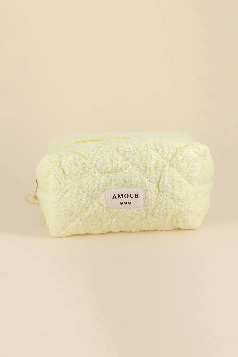 Diese gerippte Polyester-Tasche ist ein praktischer Alltagsbegleiter mit einem charmanten Detail: dem Schriftzug „AMOUR“ und drei kleinen Herzen. Ob für Toilettenartikel, Make-up oder Reiseutensilien – sie bietet viel Stauraum und sieht dabei stilvoll aus.