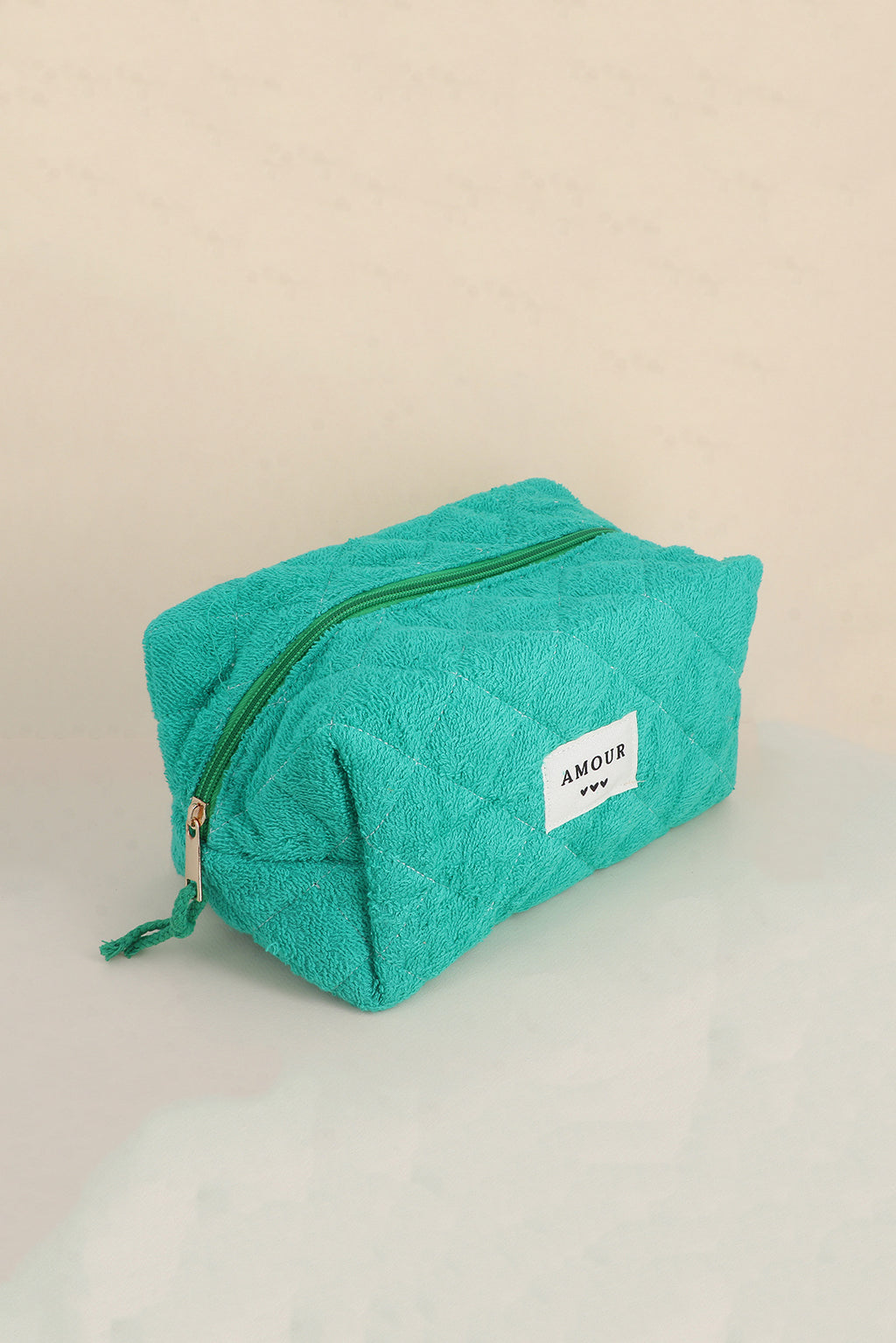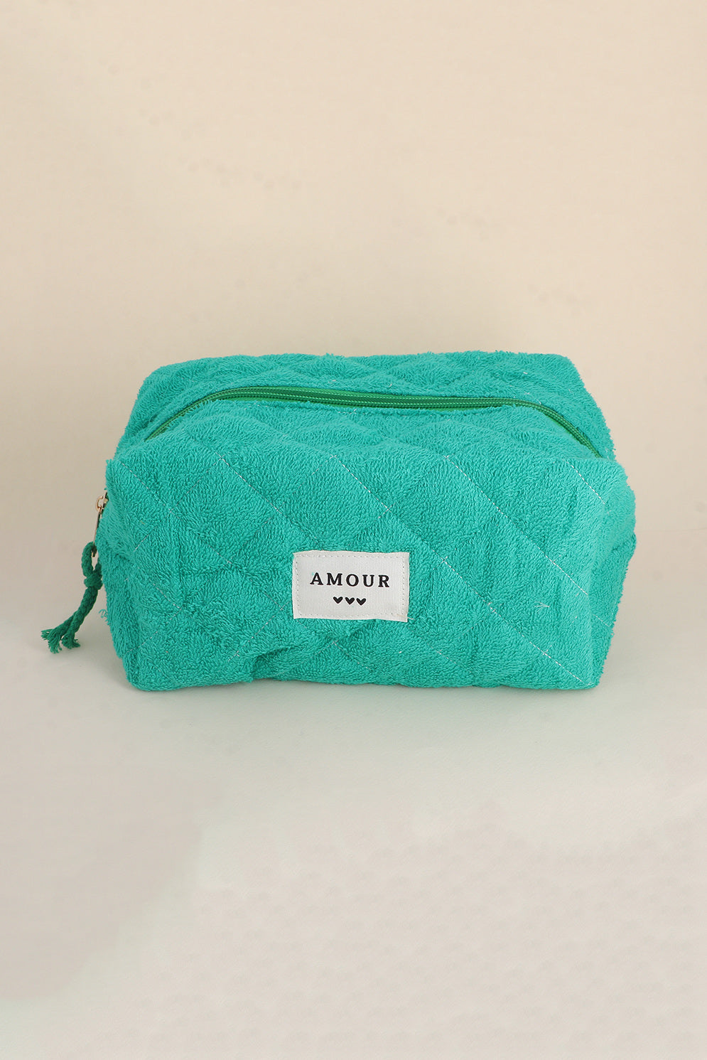Diese gerippte Polyester-Tasche ist ein praktischer Alltagsbegleiter mit einem charmanten Detail: dem Schriftzug „AMOUR“ und drei kleinen Herzen. Ob für Toilettenartikel, Make-up oder Reiseutensilien – sie bietet viel Stauraum und sieht dabei stilvoll aus.