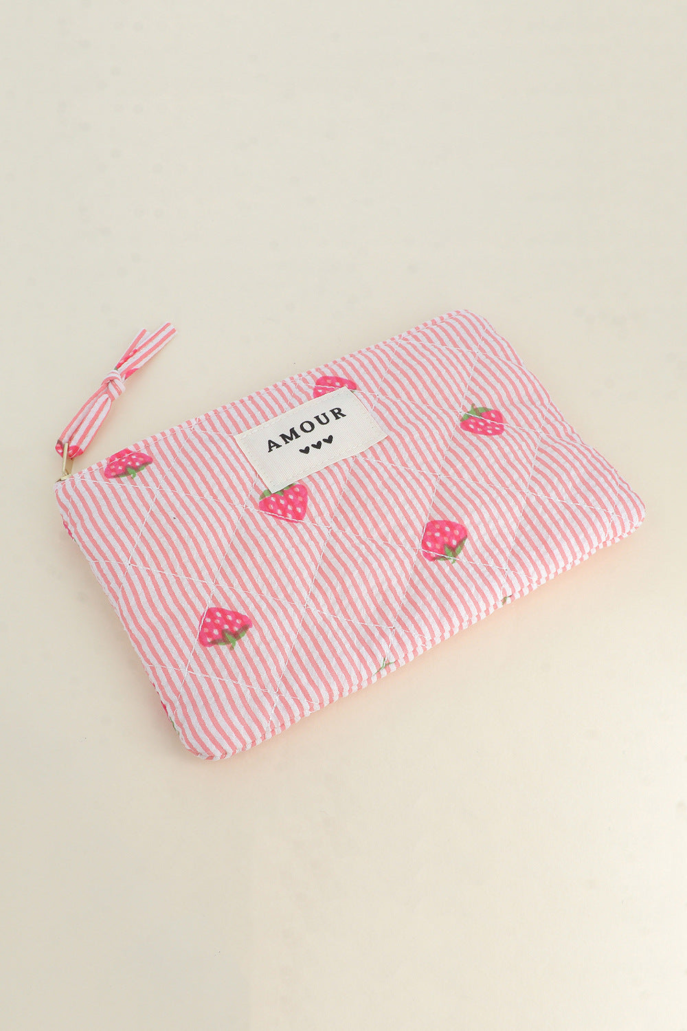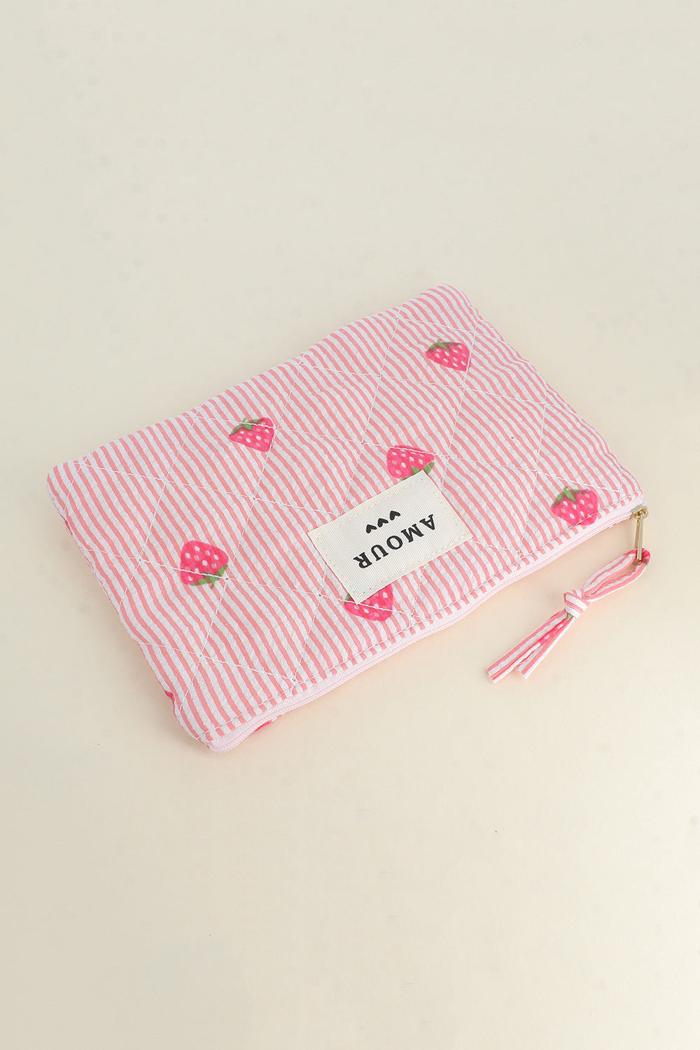 Diese hübsche, gerippte Tasche mit floralem Print und dem Schriftzug „LIEBE“ samt drei kleinen Herzen ist ein praktischer Begleiter für jeden Tag. Ob für Kosmetik, Pflegeprodukte oder kleine Alltagsgegenstände – sie bietet ausreichend Platz und sieht dabei stilvoll aus.