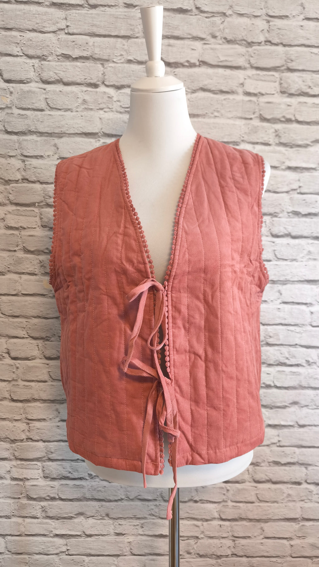 Diese stilvolle ärmellose Cordweste aus 100 % Baumwolle überzeugt durch ihren weichen Griff und ein angenehm glattes Polyesterfutter, das für zusätzlichen Komfort sorgt. Der Knotenverschluss auf der Vorderseite und die zarten, femininen Details verleihen ihr einen charmanten, verspielten Look.